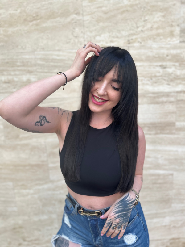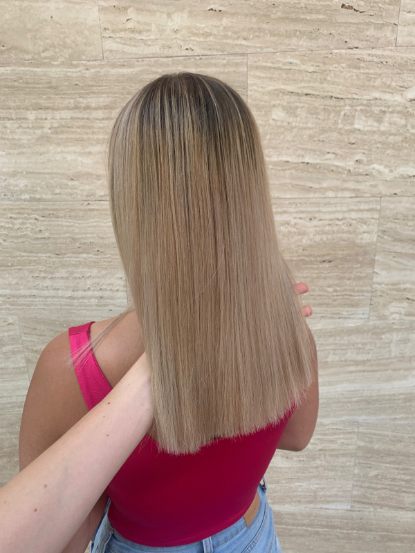 With the Airtouch technique, we create a seamless blend that remains natural-looking even as the hair grows out, making it sufficient to repeat the lightening process only every six months. Using a blow dryer, we gently blow out the baby hairs to form the transition, so the lightener is applied only to the selected strands while the blown-out hairs remain untouched. The technique is done with foil. The result is a natural, beautifully bright and dynamic blonde shade.