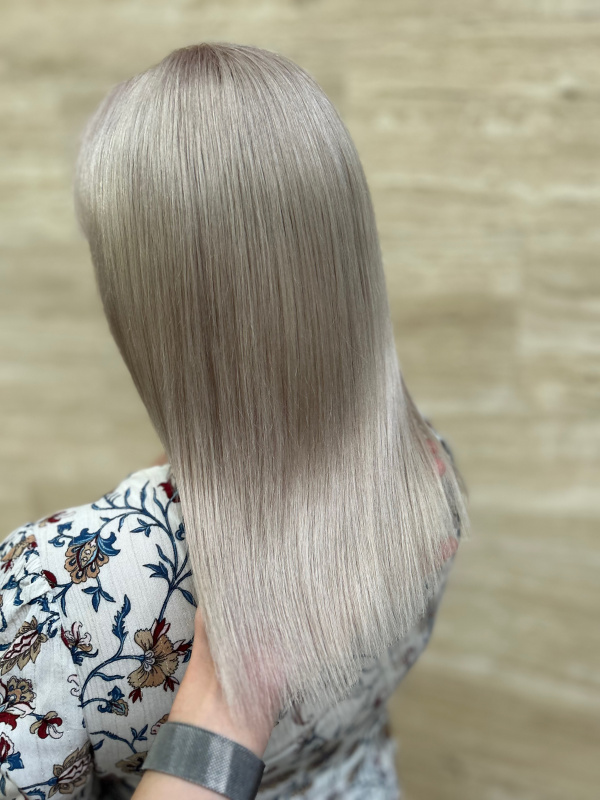 This service neutralizes any remaining reddish or yellow tones in previously lightened hair using a professional toning process. It includes full-length color application, a health trim, washing, and styling.